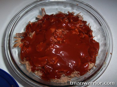 Now all you need to do is shred the meat up. I use a couple metal forks to get it going. I’ve heard good things about these kinds of devices but never used them myself. Once you have it loosened up a little, you can just pull it apart with your hands more or less. You want to divide up the good meat from the fat, gristle, etc. Anything that doesn’t look like good meat, throw away. This is probably the most difficult part of this recipe, but it isn’t that bad. It can be a little time consuming, but if you do a good job you will be rewarded with the final product. 🙂