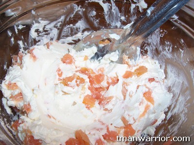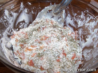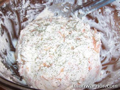 Like I said before, mixing the cream cheese and everything up is definitely the hardest part of all this. I usually use a big metal slotted spoon I have and push down on the cream cheese, mix it all around, push down again, etc. It can definitely be tough and you have to put a little muscle into it. It helps to leave the cream cheese out for a bit before you do this so it softens up a little. I add some salmon, mix it up, add some more, mix it up, until I’ve used it all. You probably don’t want to add it all at once, it seems a little harder to mix that way to me.