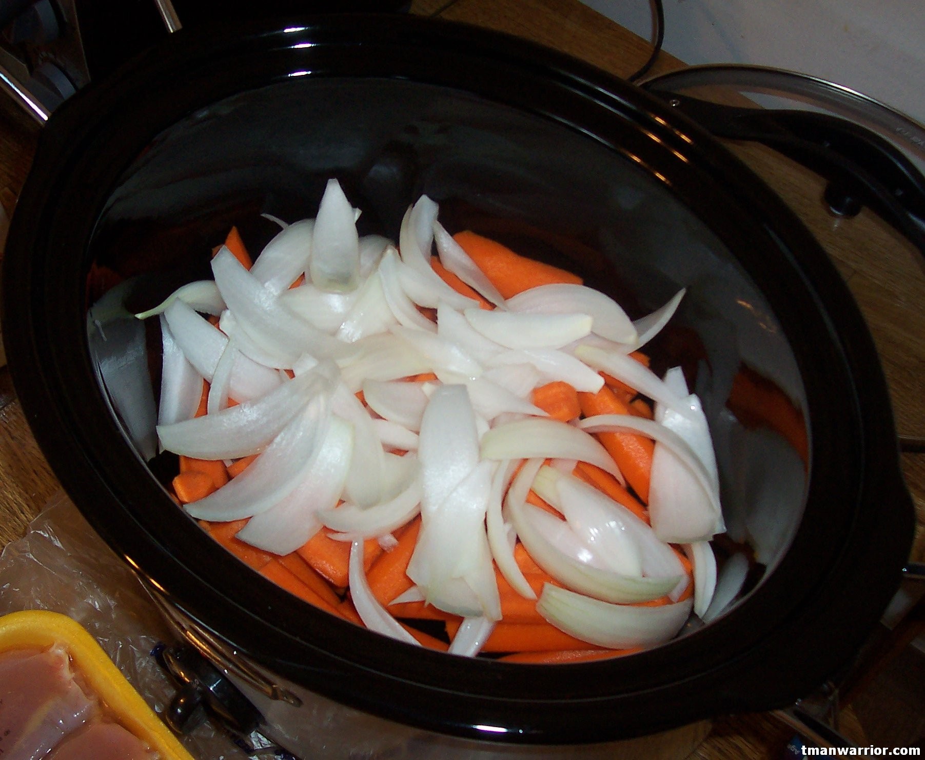 First, I cut up the carrots and onion. You want to lay these on the bottom of the