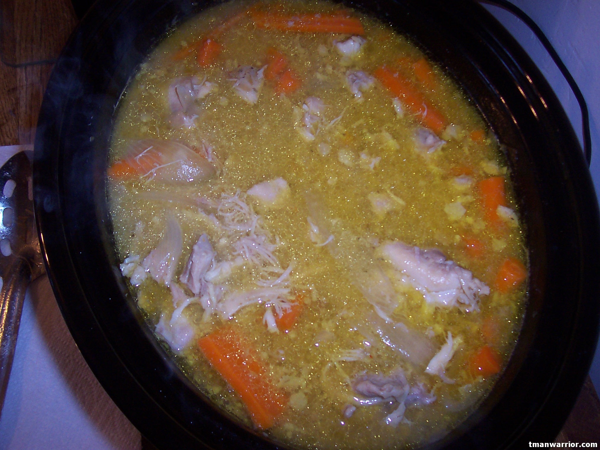 After you have all of your chicken in, sprinkle it liberally with the chicken seasoning. The one I use has a lot of good spices in it, like rosemary, thyme, parsley, etc. This really adds a great flavor to the soup. I don’t think you can really add too much, but don’t go dumping in a bucketful or anything. 🙂